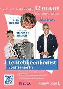 Op donderdag 12 maart 2026 vindt de lentebijeenkomst voor senioren plaats in Centrum Ysara. Een gezellige namiddag met heerlijke muziek met niemand minder dan Lisa Del Bo, Thomas Julian en Christoff. Ook is er tussen de optredens door een informatieve sessie rond de projecten van Stad Nieuwpoort toegelicht door de burgemeester Kris Vandecasteele.